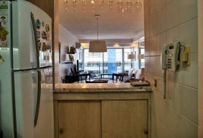 Living comedor con salida a terraza con vista al mar. Cocina integrada equipada con línea blanca.