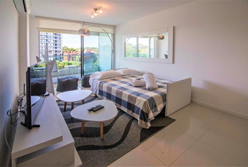 Cómodo apartamento de 1 Dormitorio. Terraza con vista al bosque y a la ciudad. Luminoso living comedor, muy funcional equipado con sofá cama. Cocina integrada completamente equipada. Aire acondicionado. TV Smart en dormitorio y living. Servicio de mucamas opcional. Garaje.