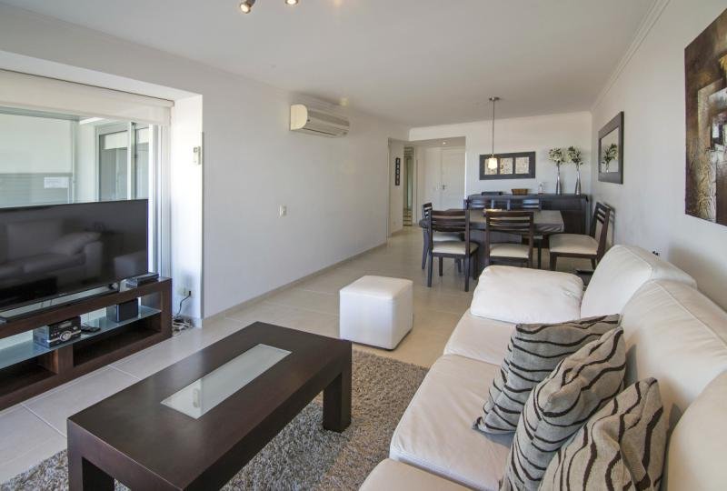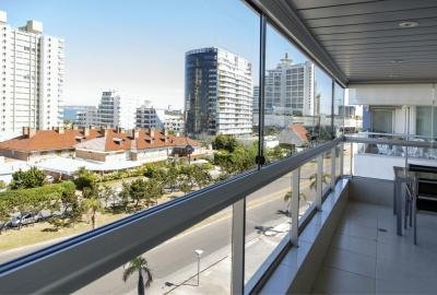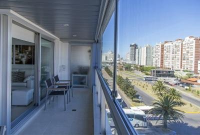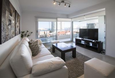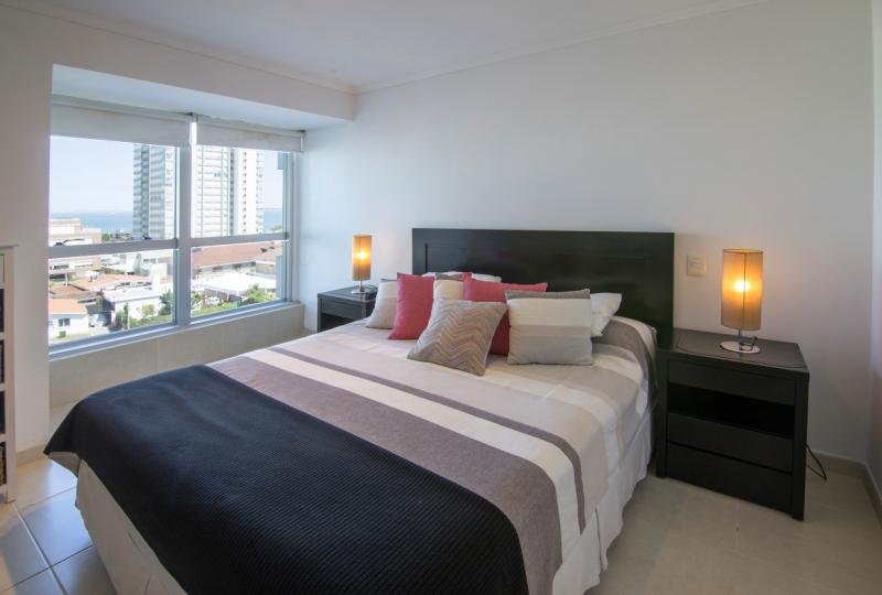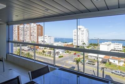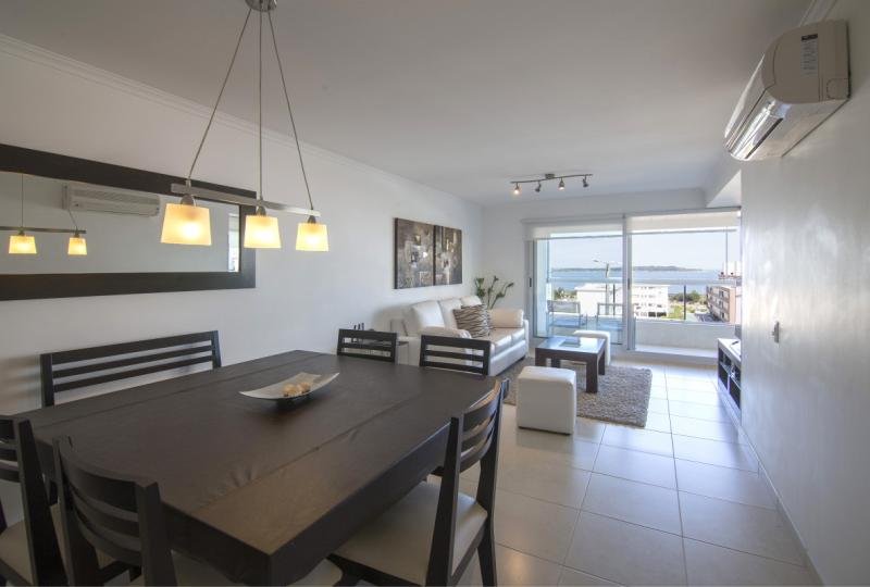 Hermoso apartamento de 2 dormitorios, principal en suite. 1 baño. Confortable living comedor con salida a cómoda terraza con vista panorámica al mar. Cocina definida completamente equipada con salida a terraza. Aire acondicionado en todos los ambientes. Garaje.
