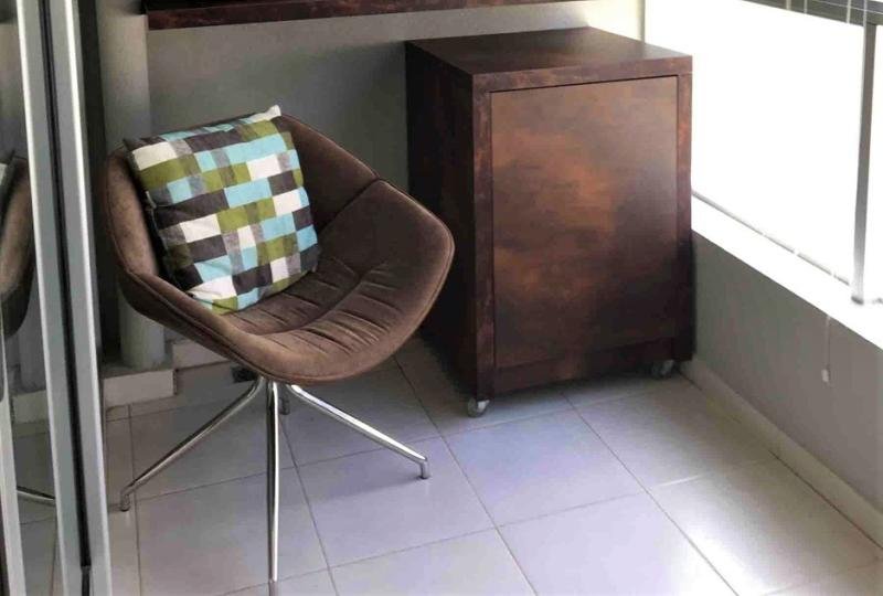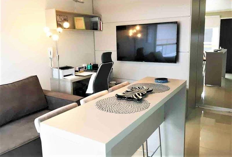 Confortable apartamento de un dormitorio, con plano original de mono ambiente. Cómodamente amueblado. Espacios funcionales. Balcón con cerramiento tipo solarium. Escritorio. Sofá cama. Aire acondicionado. Cocina integrada completamente equipada. Microondas. Horno eléctrico. Anafe eléctrico. Cuenta con servicio semanal de mucama.