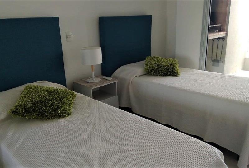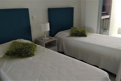 Suite principal con cama matrimonial, segunda suite dos camas de una plaza, living con sofá cama.