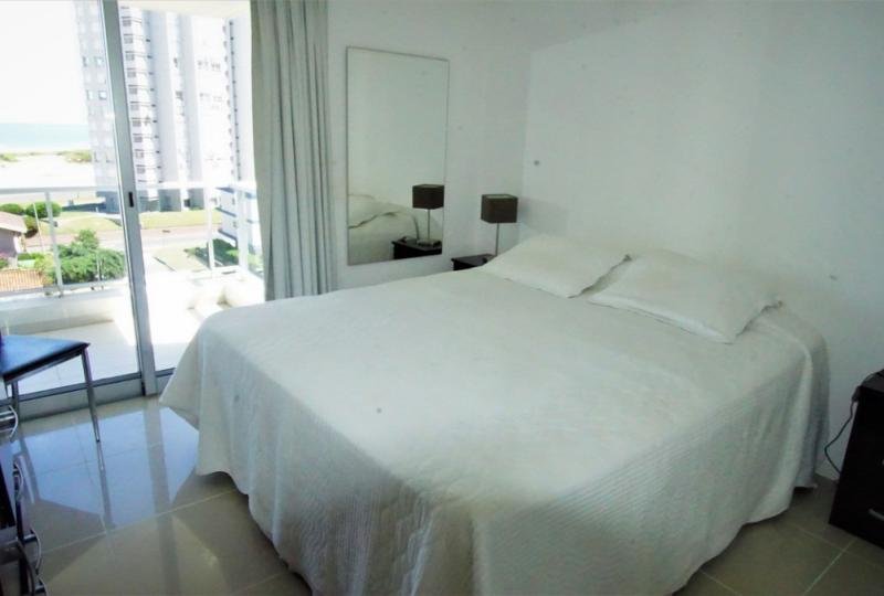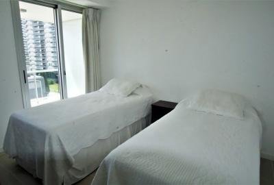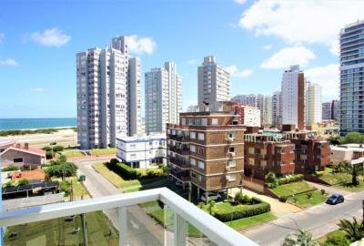 Hermoso apartamento esquinero. Dos dormitorios, principal en suite con salida a terraza principal, dos baños. Living comedor bien iluminado con salida a terraza con vista a Playa Brava. Cocina integrada equipada con línea blanca. Dormitorio con balcón privado con vista al mar. Aire acondicionado en suite principal. Cuenta con una cama queen y dos camas de una plaza. Ropa Blanca. Garaje.