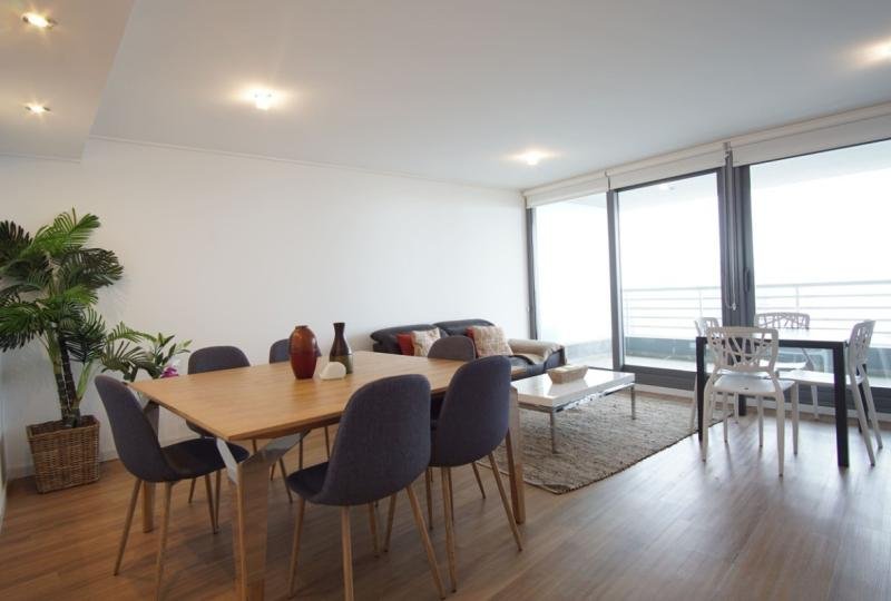 Amplio y confortable living comedor con salida a terraza con vista al mar. Cocina definida, completamente equipada con salida a terraza lavadero.