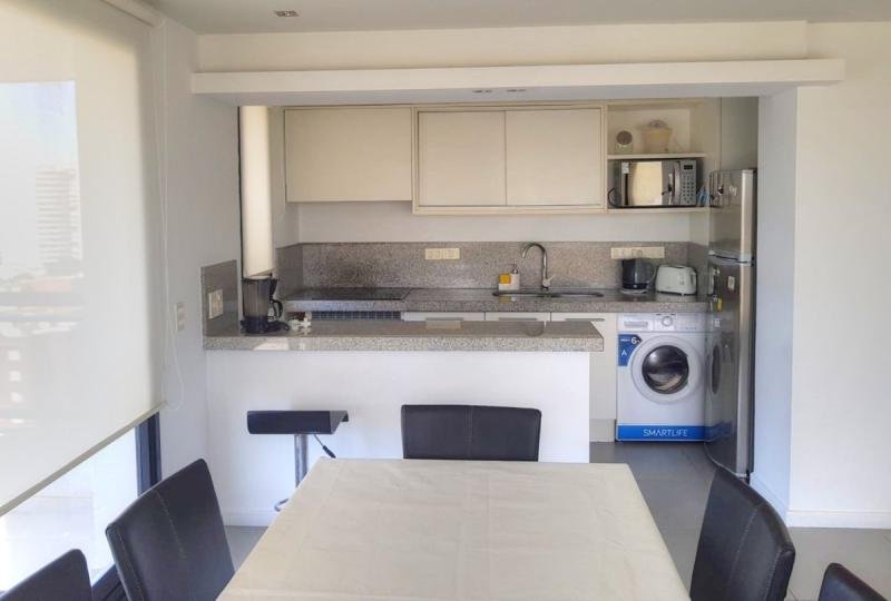 Living comedor muy iluminado con salida a terraza. Cocina integrada, completamente equipada con línea blanca. Aire acondicionado en ambientes principales. Garaje.