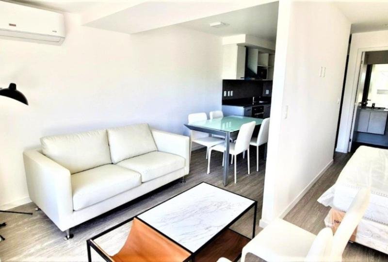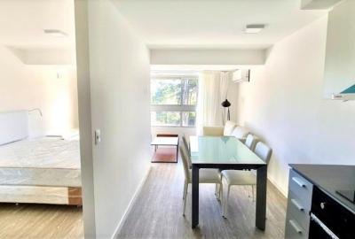 Apartamento funcional a estrenar. Mobiliario nuevo. Cocina integrada equipada con modernos electrodomésticos y living comedor. Baño completo. Área de dormitorio semi integrada. Aire acondicionado. Garaje.